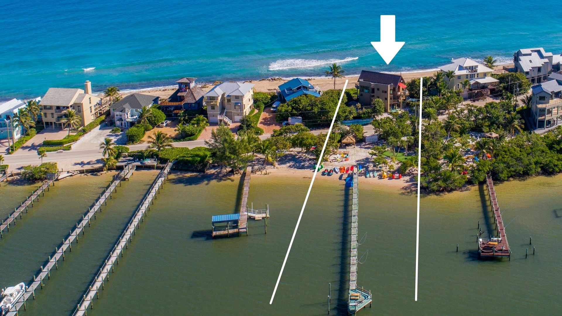 The beach is situated on a private beach in a quiet residential area — there are no condos, high rises or large public beaches for miles. (No crowds, just a beach all to yourself and your group). The Atlantic Ocean is right off your back porch. Right across the street is your own 250-foot-long deep-water private dock on the Indian River, offering some of the best fishing in the world and stocked with all your favorite water toys. (complimentary kayaks, paddleboards, snorkel gear, bicycles, boogie boards, inflatable rafts, fishing poles and tackle, metal detectors, and more)